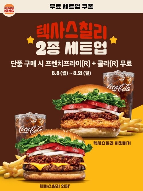 텍사스칠리 치킨버거와 텍사스칠리 와퍼, 버거 2종에 대해서 무료 세트업 쿠폰을 받아서 이용하실 수 있습니다. 쿠폰은 카카오톡에서 받아서 바로 이용 가능합니다.